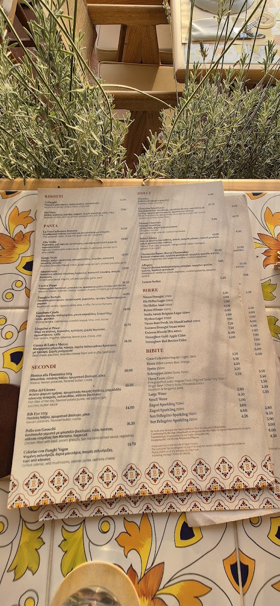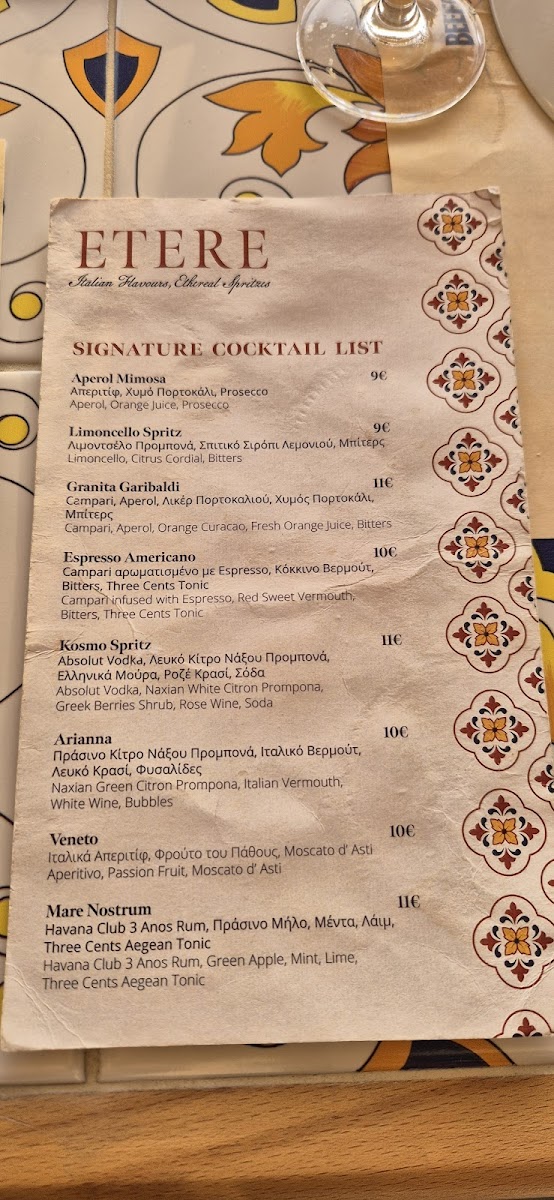 Welcome to ETERE Ristorante•Spritzeria, nestled in the scenic Σχοινούσας, Kiprou &, Naxos, Greece. This charming establishment is a must-visit for all Italian cuisine enthusiasts. The menu showcases a delightful array of dishes, featuring fresh ingredients that burst with rich flavors. Signature highlights include exquisitely presented antipasti and perfectly cooked pasta, creating an authentic Italian dining experience that is hard to forget.